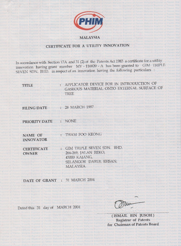 APPLICATOR DEVICE for Introduction of Gaseous Material onto Surface of Tree (Malaysia) | ORGANIC FERTILIZER (Malaysia)